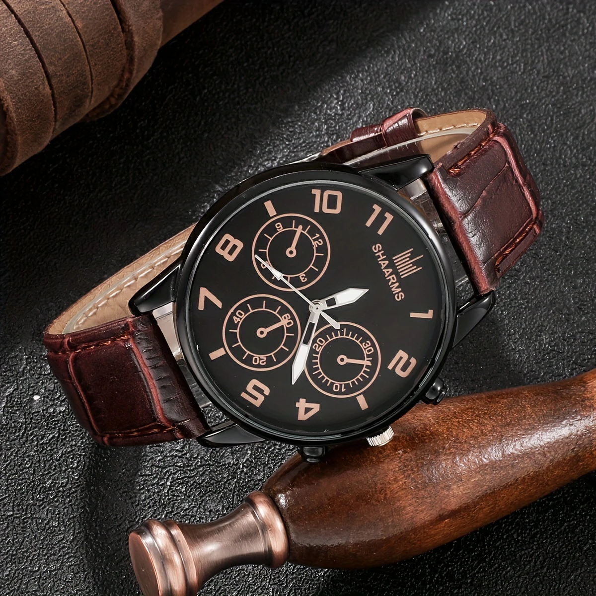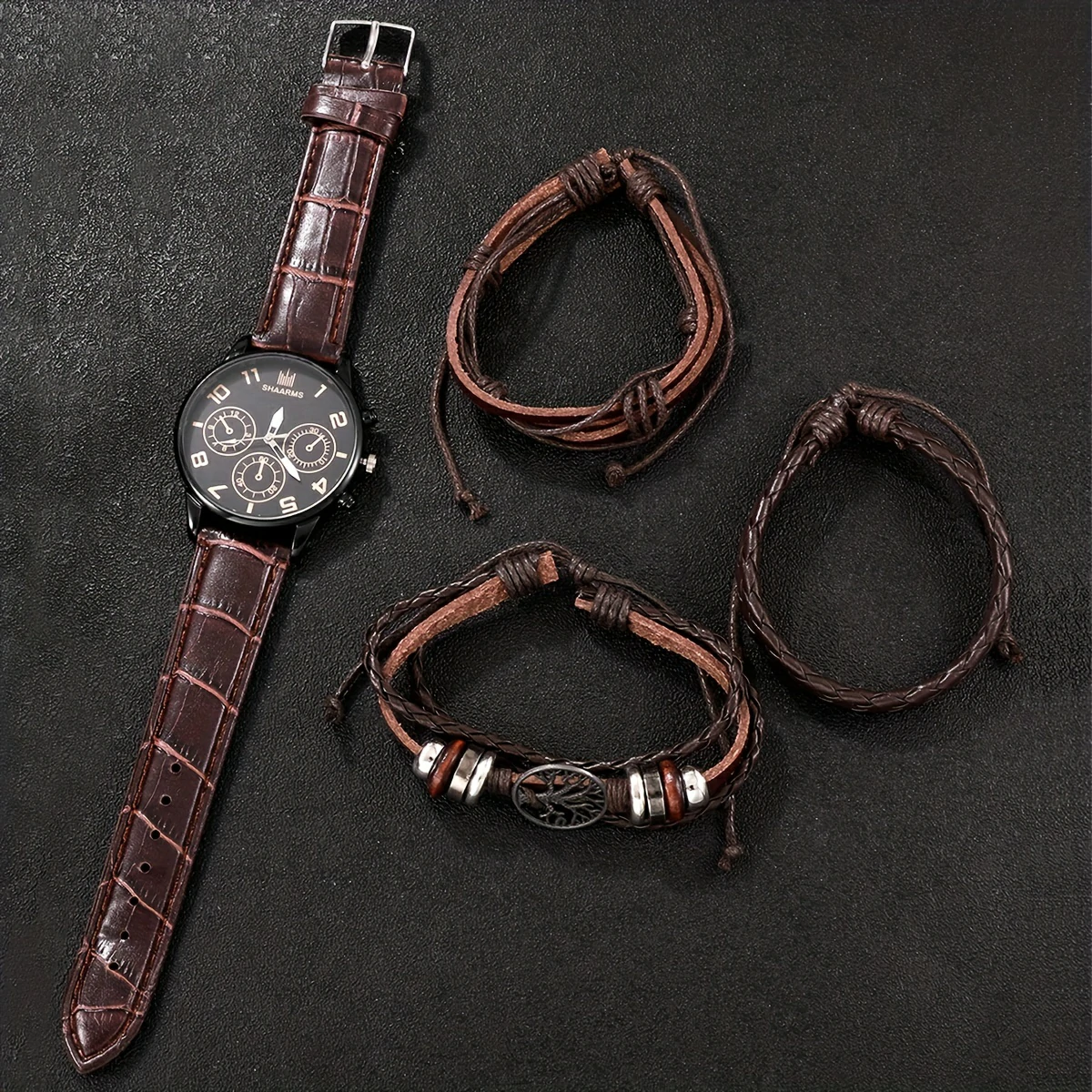 Elevate your style with our 4pc/set, featuring a sleek Men’s Business PU Leather Watch and 3pcs Braided Bracelets